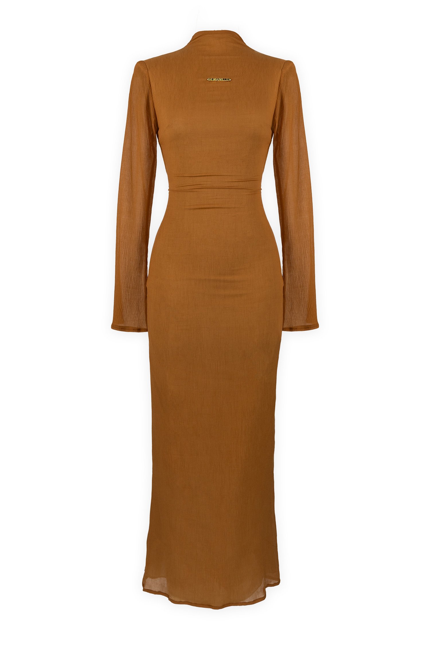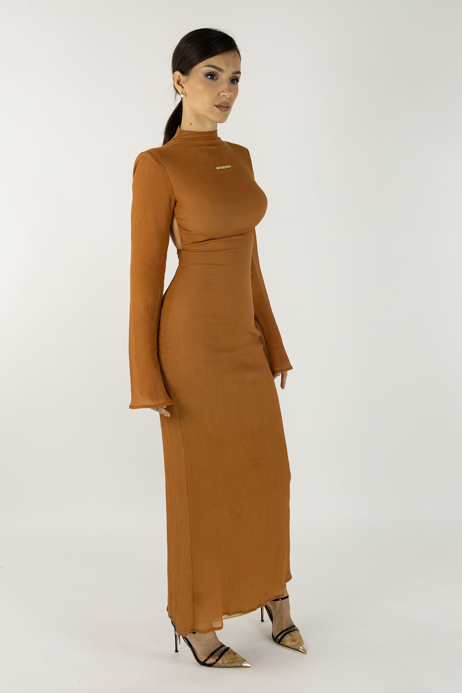 A refined black maxi skirt featuring a high-waist silhouette, asymmetrical waist paneling, a smooth structured finish, and a sleek body-hugging fit. Designed with a back slit for comfortable movement and accented with a small gold logo detail at the waist for a polished, modern look.