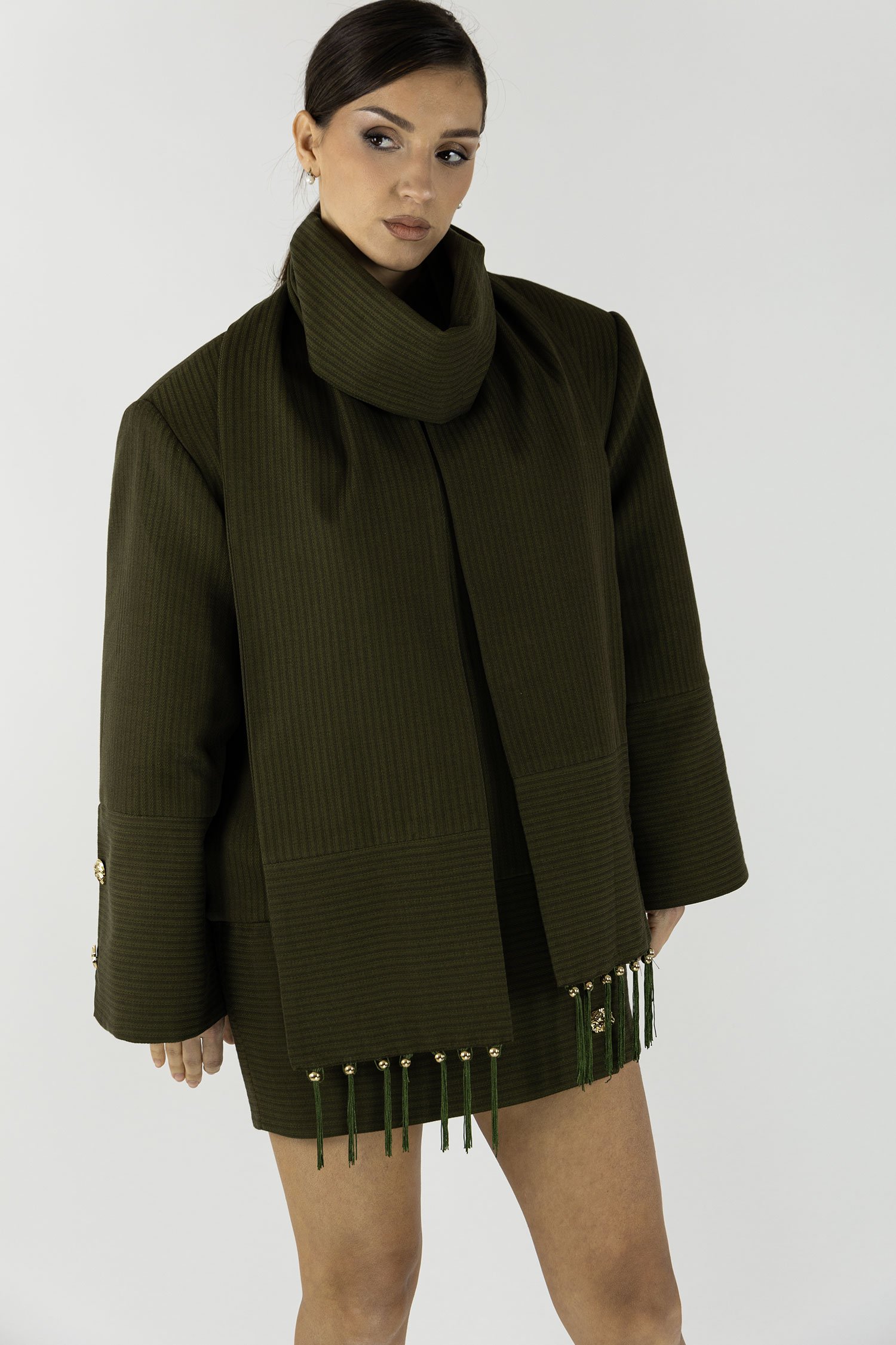 Voluminous mid-length coat crafted from dense, soft wool in a deep charcoal tone. Designed with a relaxed, oversized silhouette featuring raglan sleeves, angled front welt pockets, and adjustable sleeve tabs. The coat closes with a concealed front placket accented by a single exposed top button in bright magenta, echoed by matching magenta buttons on the sleeve tabs and along the back vent. A structured collar and a long inverted back pleat enhance movement and shape, giving the piece a sculptural, modern profile.